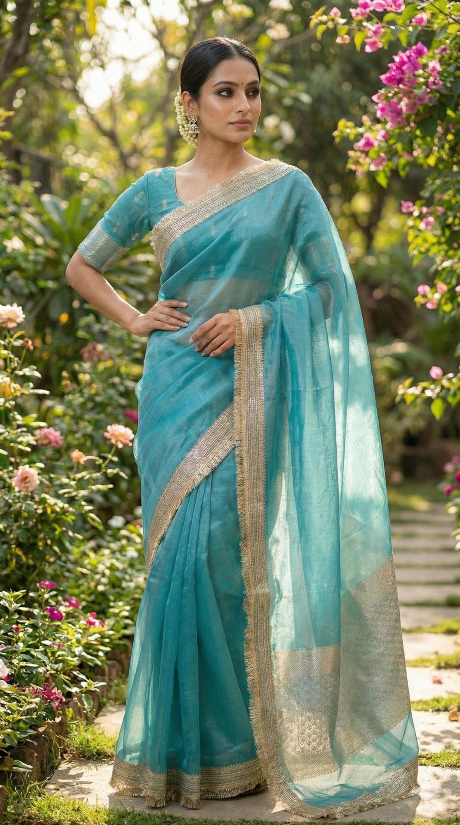 Elevate your ethnic wardrobe with this exquisite tissue saree in serene sea blue, crafted for those who appreciate refined elegance. The delicate fabric drapes beautifully, offering comfort without compromising on sophistication. Adorned with intricate golden lace detailing, this saree strikes the perfect balance between traditional charm and contemporary grace. The accompanying zari-embellished blouse piece complements the ensemble seamlessly, making it an ideal choice for festive occasions, celebrations, or formal gatherings. A timeless investment piece that transcends seasons and trends.Saree comes with 5.5 mtrs and 85cm Blouse piece.